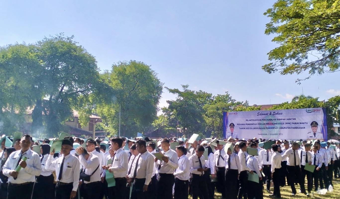 Pamekasan – Pemerintah Kabupaten Pamekasan resmi mengukuhkan 4.160 Pegawai Pemerintah dengan Perjanjian Kerja (PPPK) Paruh Waktu Tahun 2025. Pelantikan dan pengambilan sumpah jabatan dipimpin langsung oleh Bupati Pamekasan, KH. Kholilurrahman, di lapangan Nagara Bhakti Pendopo Ronggosukowati, Rabu (17/12/2025) pagi.