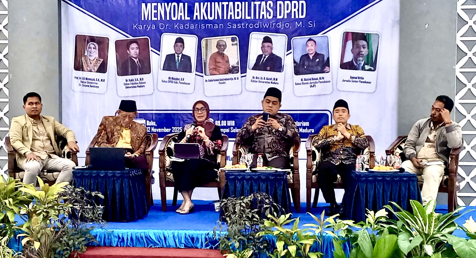 Penulis buku hadir langsung bersama enam tokoh yang turut menjadi pembedah, di antaranya Rektor Universitas Dr. Soetomo Surabaya, Prof. Dr. Siti Marwiyah, Dekan Fakultas Hukum UNIRA, Dr. Nadir, Ketua DPRD Pamekasan, Ali Masykur, Rektor UNIRA Dr. Drs. Ec. H. Gazali, Ketua AJP M. Khairul Umam, dan jurnalis senior Pamekasan, Samsul Arifin.