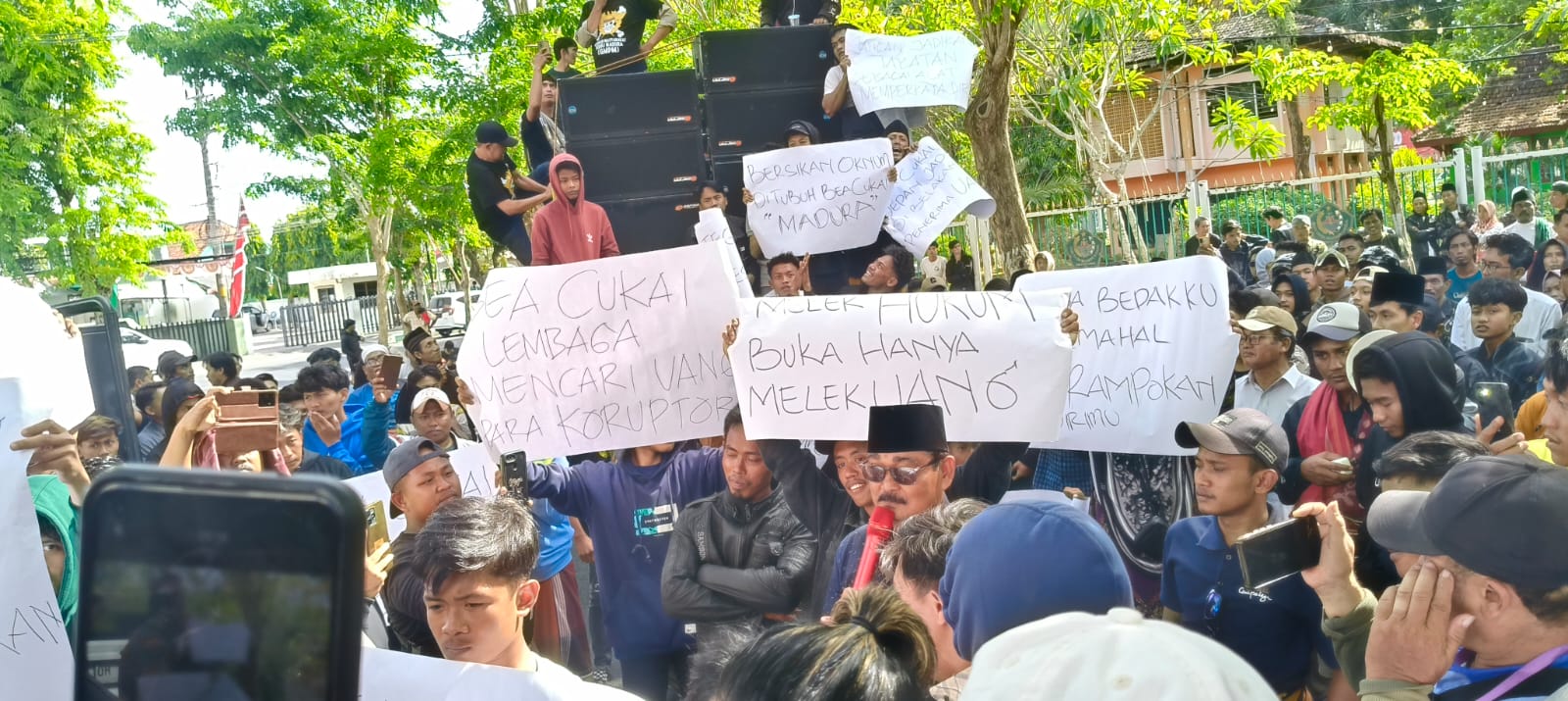 Massa GMPM yang mengaku berasal dari empat kabupaten di Madura, mulai mengepung Kantor Pengawasan dan Pelayanan Bea dan Cukai (KPPBC) Tipe Madya Pabean (TMP) C Madura, sejak Rabu siang dengan membawa berbagai poster berisikan protes dan kekecewaan warga.
