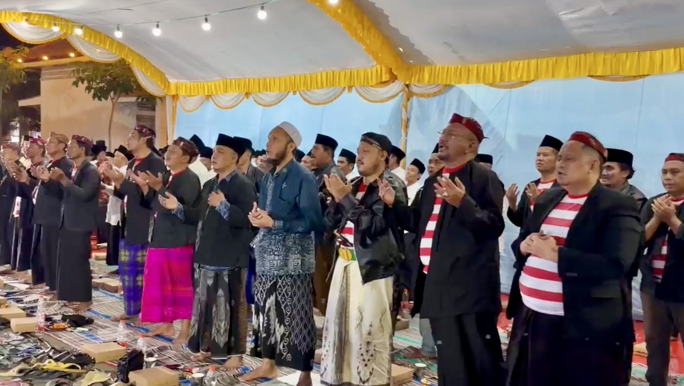 KHIDMAT: Sejumlah tokoh masyarakat, kiai, kepala desa dan pengusaha di Kabupaten Pamekasan terlihat khidmat bermunajat di tengah pelaksanaan tradisi kesenian Macapat Samman, Jumat (17/4/2026) malam di Monumen Arek Lancor.
