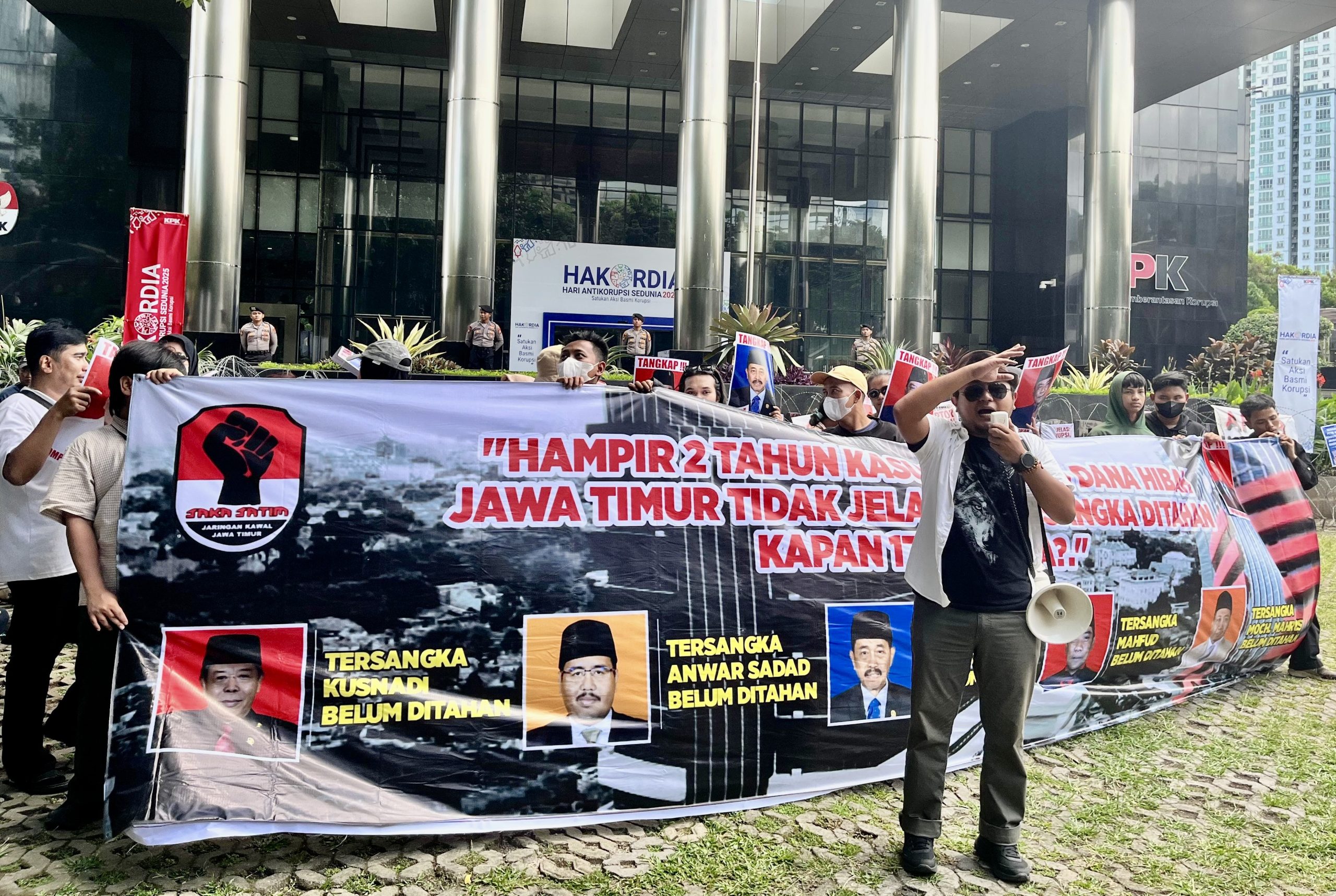 Jakarta — Aksi demonstrasi terjadi di depan Gedung Komisi Pemberantasan Korupsi (KPK) RI, Senin (8/12/2025). Puluhan massa dari Jaringan Kawal Jawa Timur (Jaka Jatim) menuntut KPK segera menahan seluruh tersangka kasus dugaan korupsi Dana Hibah APBD Provinsi Jawa Timur, yang dinilai mandek penanganannya.